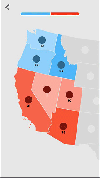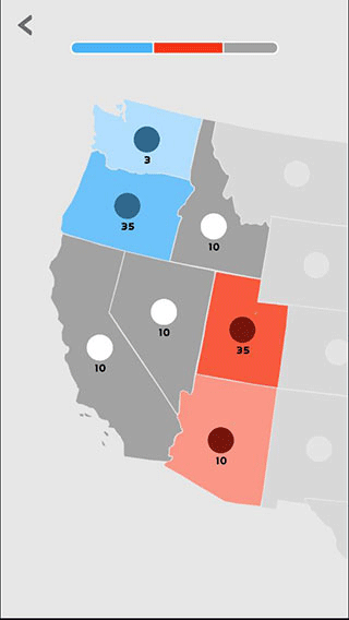 3、點(diǎn)擊拖動地圖塊中間的圓點(diǎn),即可表示派遣單位進(jìn)行攻擊擴(kuò)張,圓點(diǎn)旁邊的數(shù)字表示單位數(shù)量,單位數(shù)量會隨著時間自動增長,數(shù)量越多,地圖塊的顏色也就越深。