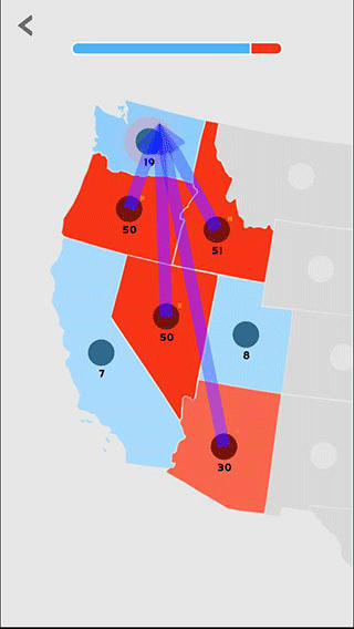 5、你還可以同時派遣多個地塊的單位進(jìn)行攻擊擴(kuò)張,具體操作方法是,點(diǎn)擊拖動我方圓點(diǎn)至另一個我方圓點(diǎn),最后再拖動至敵方地塊,這樣做可以有效的攻占敵方的地塊。