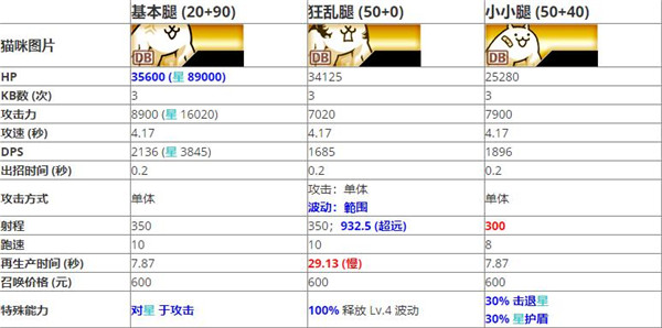 2、小小腿貓數(shù)值大多和基本腿貓相似。一樣都是對(duì)異星敵人的角色,基本腿貓是于攻擊,小小腿則是給到擊退的控場(chǎng)效果。相比之下,在正面對(duì)決方面,基本腿擁有更好的白板數(shù)值、加上于攻擊給予的血量加成;而在控場(chǎng)方面通常也都有超能力貓、漂流貓搶飯碗等