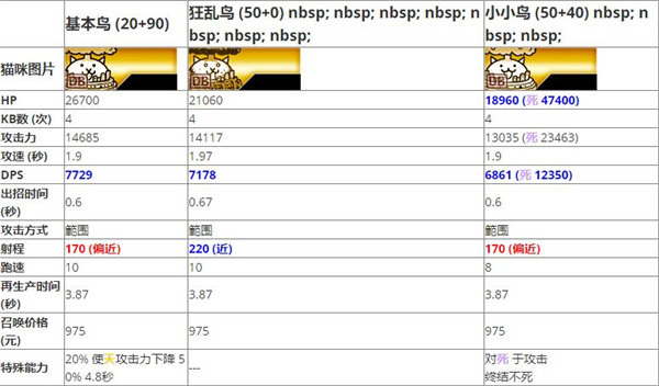 1、整體數(shù)值就是基本牛貓的下位替換版本,但由于基本牛貓的出場(chǎng)率不高,所以...咳咳...畢竟大狂亂牛的範(fàn)圍攻擊+66跑速實(shí)在太香,除了聯(lián)組功能或速攻,沒(méi)人會(huì)用基本牛...