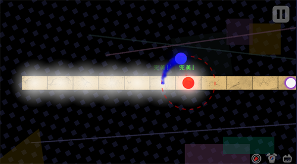 3、點(diǎn)擊控制小球走到右邊的圓圈里,開(kāi)始時(shí)會(huì)有點(diǎn)難,跟上音樂(lè)的節(jié)奏來(lái)按,每次重音點(diǎn)擊一下,會(huì)控制小球走直線。快半拍則是向上或者向下。