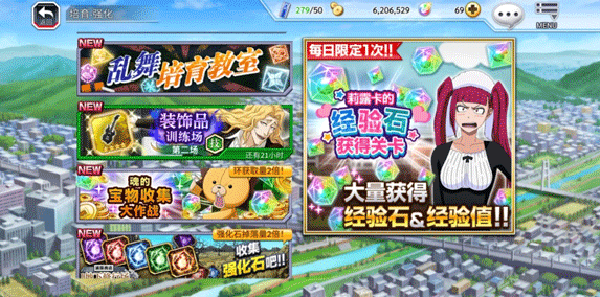 玩家可以通過消耗同稀有度同名人物或消耗必殺技的秘訣來提升必殺技等級。必殺技的秘訣共兩種:特定屬性的必殺技的秘訣(知、力、技、速、心)只能強化相同屬性的人物以及必殺技的秘訣(虹)可用于強化任何屬性的人物必殺技。同稀有度同名人物則意味著被消耗角色的屬性、稀有度、名字都需與基底角色相同,等級無要求,比如:消耗1級5星黑崎一護可以使100級5星黑崎一護的必殺技等級從1升級為2。